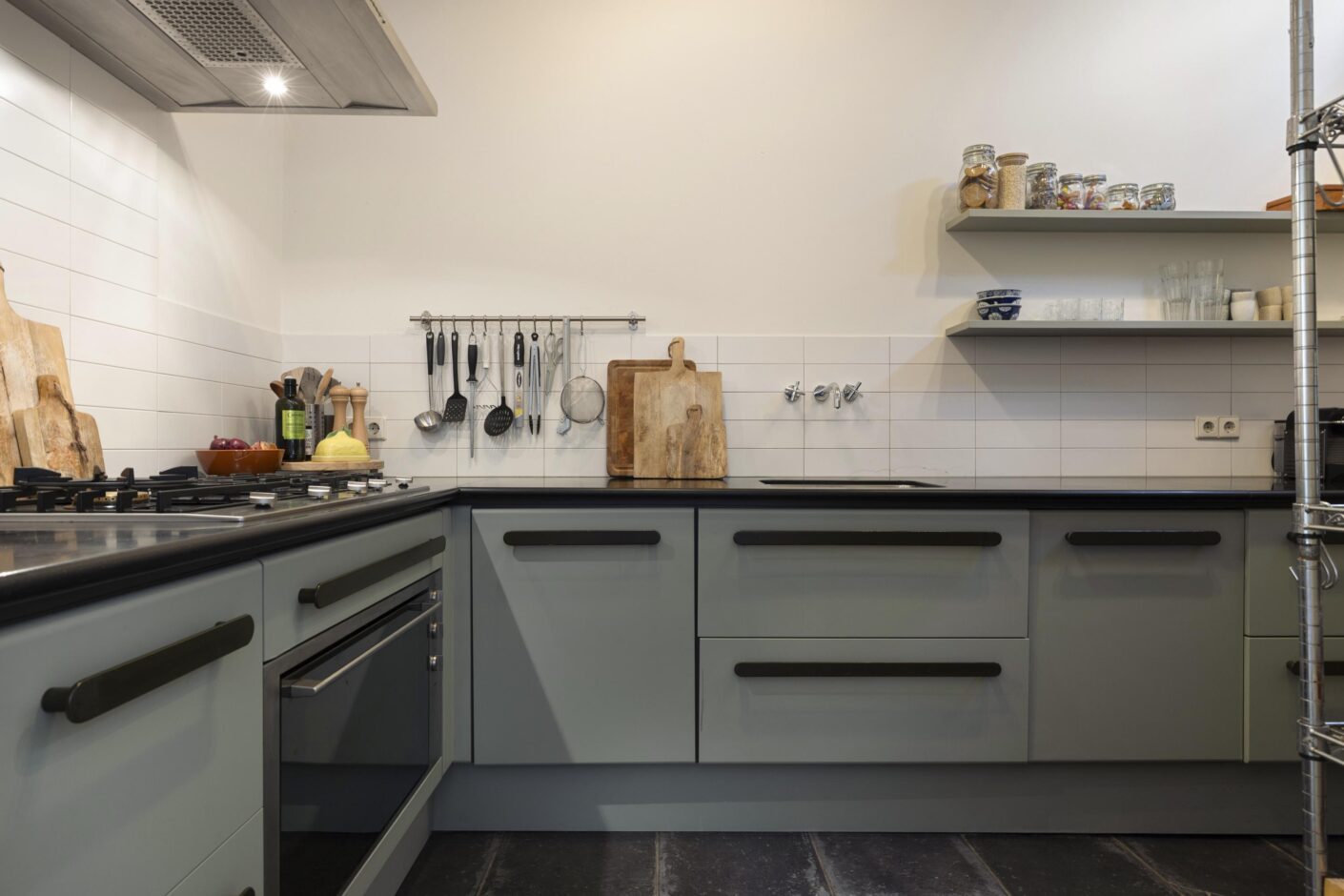 half open keuken met 5-pits gaskookplaat, afzuigkap, oven, vaatwasser en losse koel-/vriescombinatie