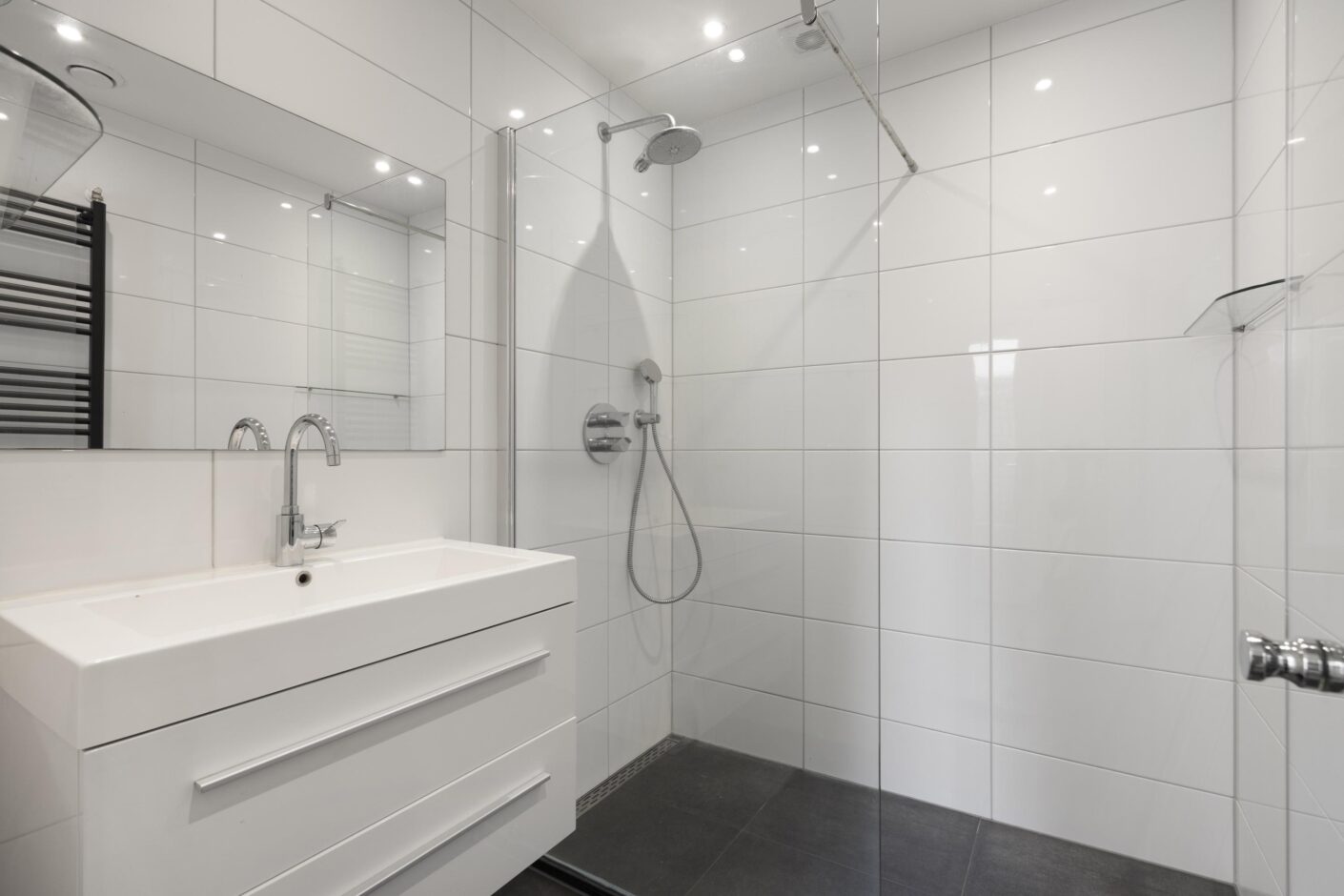 moderne badkamer met inloopdouche, wastafelmeubel en designradiator