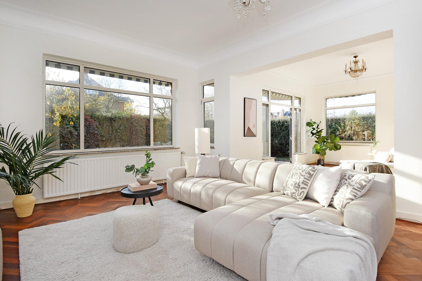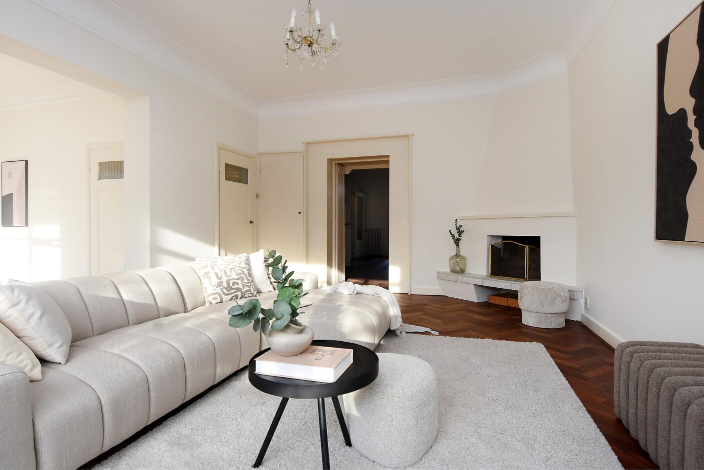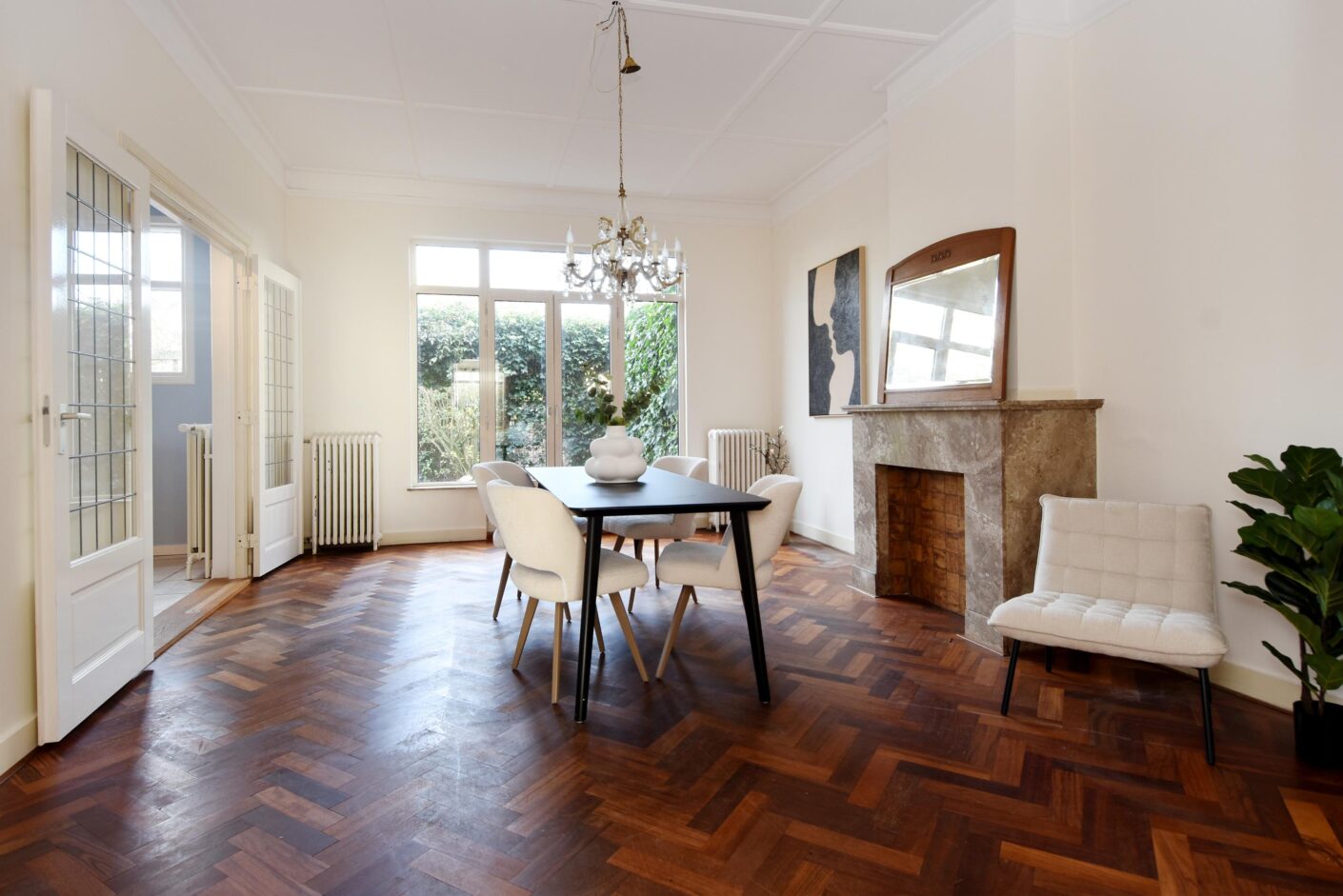 woon-/eetkamer en-suite met schuifseparatie, vaste kasten, open haard en bijgetrokken voorzijkamer