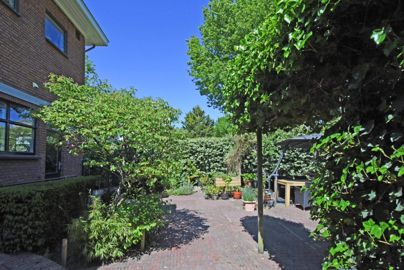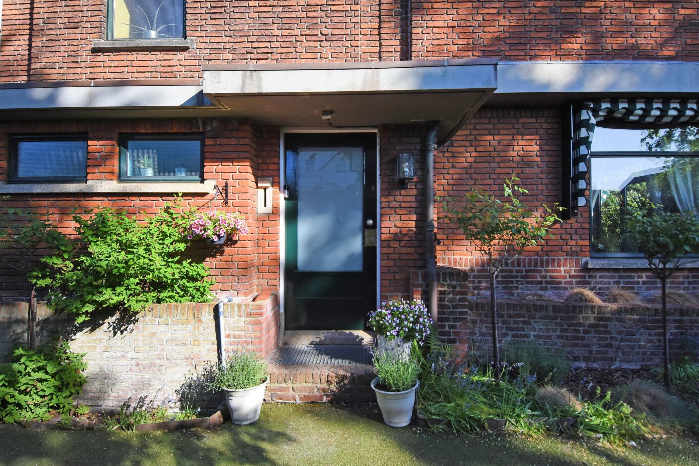 De villa is gelegen op eigen grond en beschikt over een oprit met garage en een heerlijk besloten tuin aan drie zijden. De bijzonder zonnige en rustige achtertuin aan de Luiksestraat vormt een echte buitenkamer — rustig, groen en volledig afgeschermd van de buitenwereld. In de voortuin op het ZW zit je ook volledig vrij zonder inkijk. Door de prachtige haag rondom is er ongekende privacy in de tuin midden in ‘t Belgisch Park.