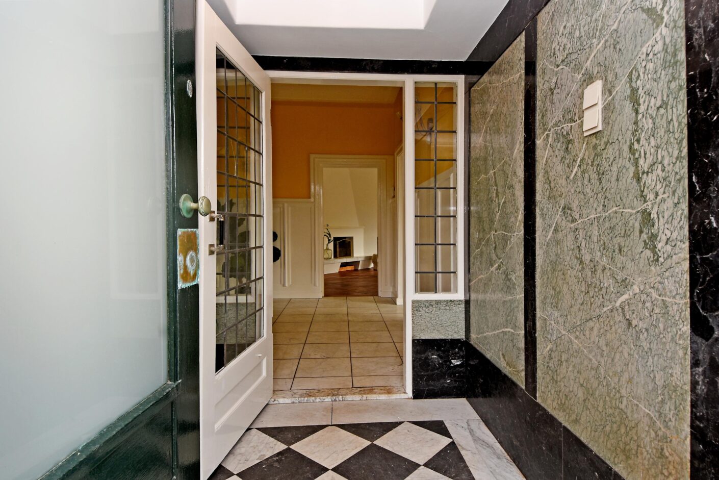 via de tuin naar entree: vestibule, mooie centrale ruime hal met toilet en fonteintje