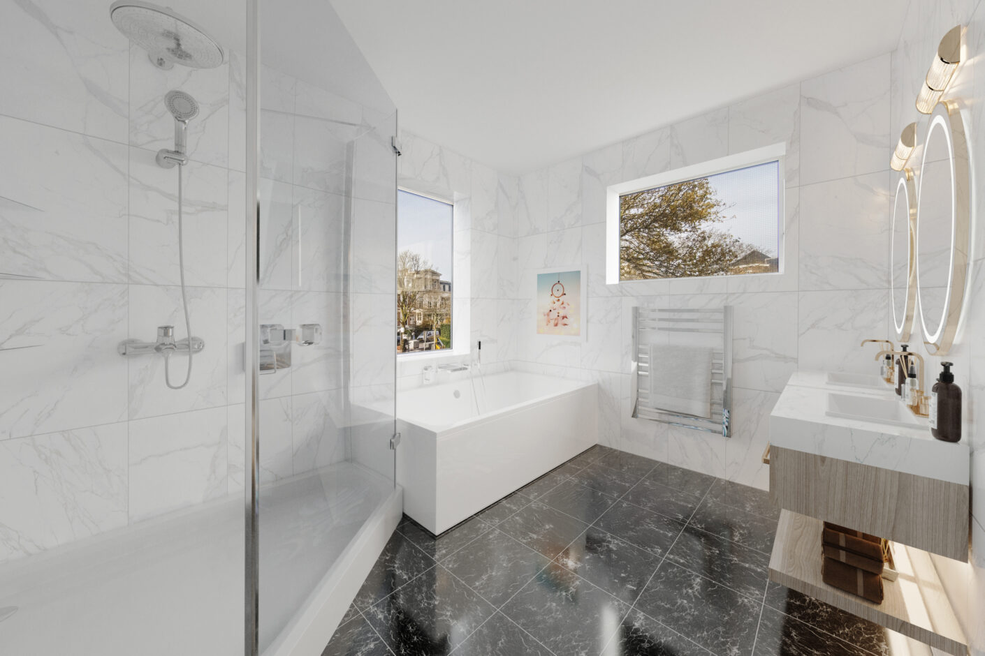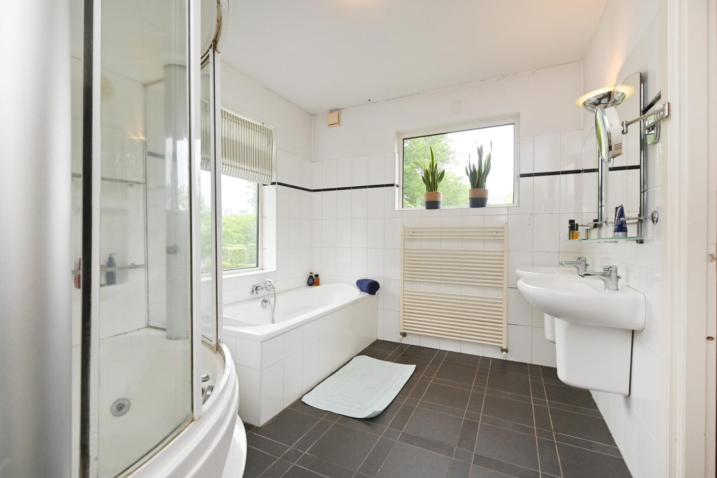 eenvoudige badkamer met ligbad, douche, toilet, dubbele wastafel en designradiator