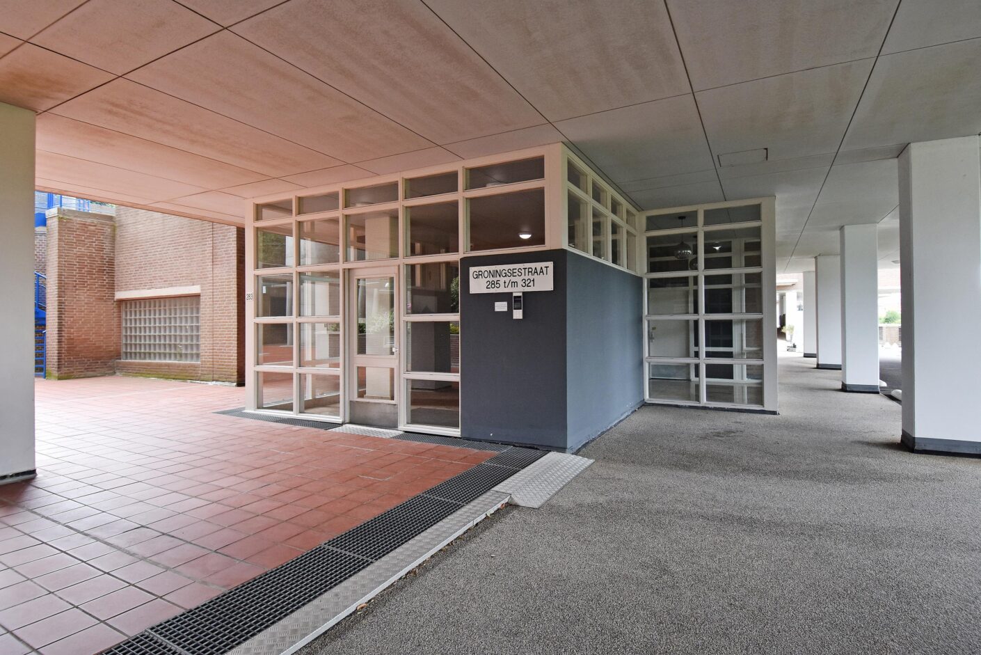 entree via hoofdingang met bellen- en brievenbustableau alsmede videofooninstallatie: