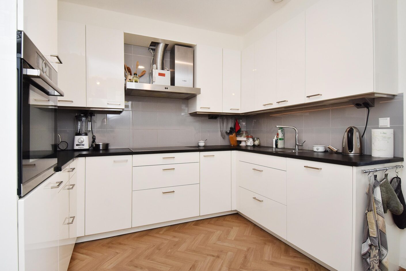 moderne keuken met vaatwasser, 5 pits inductiekookplaat, afzuigkap, combi oven en opstelplaats met koelkast en vriezer