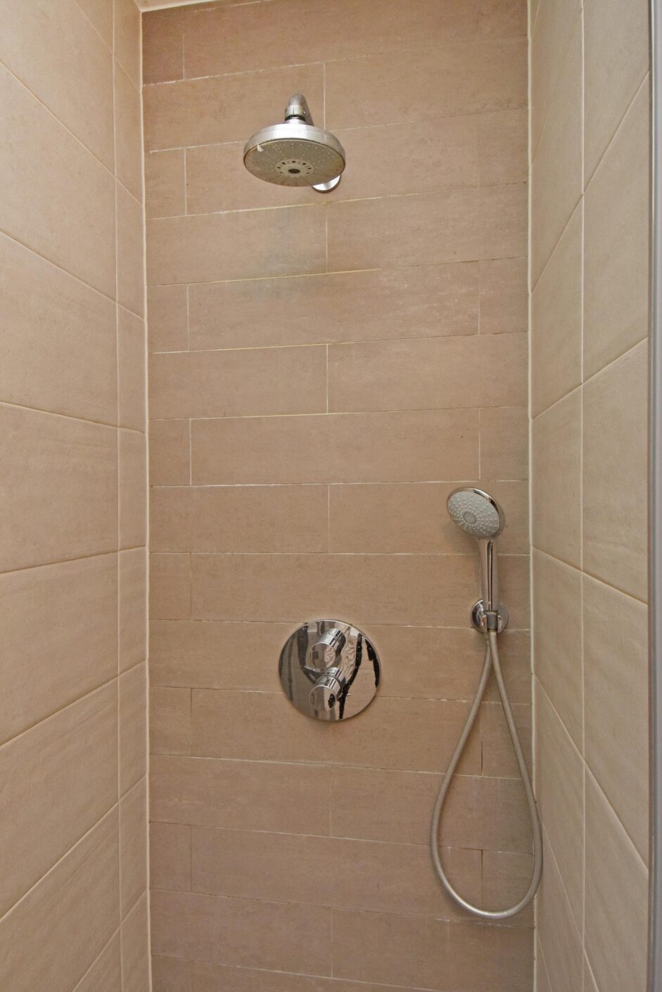 Spacious bathroom with walk-in shower, bathtub, electric paperless toilet with bidet function, designer radiator, and bathroom cabinet with washbasin