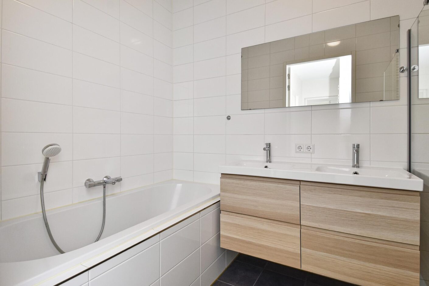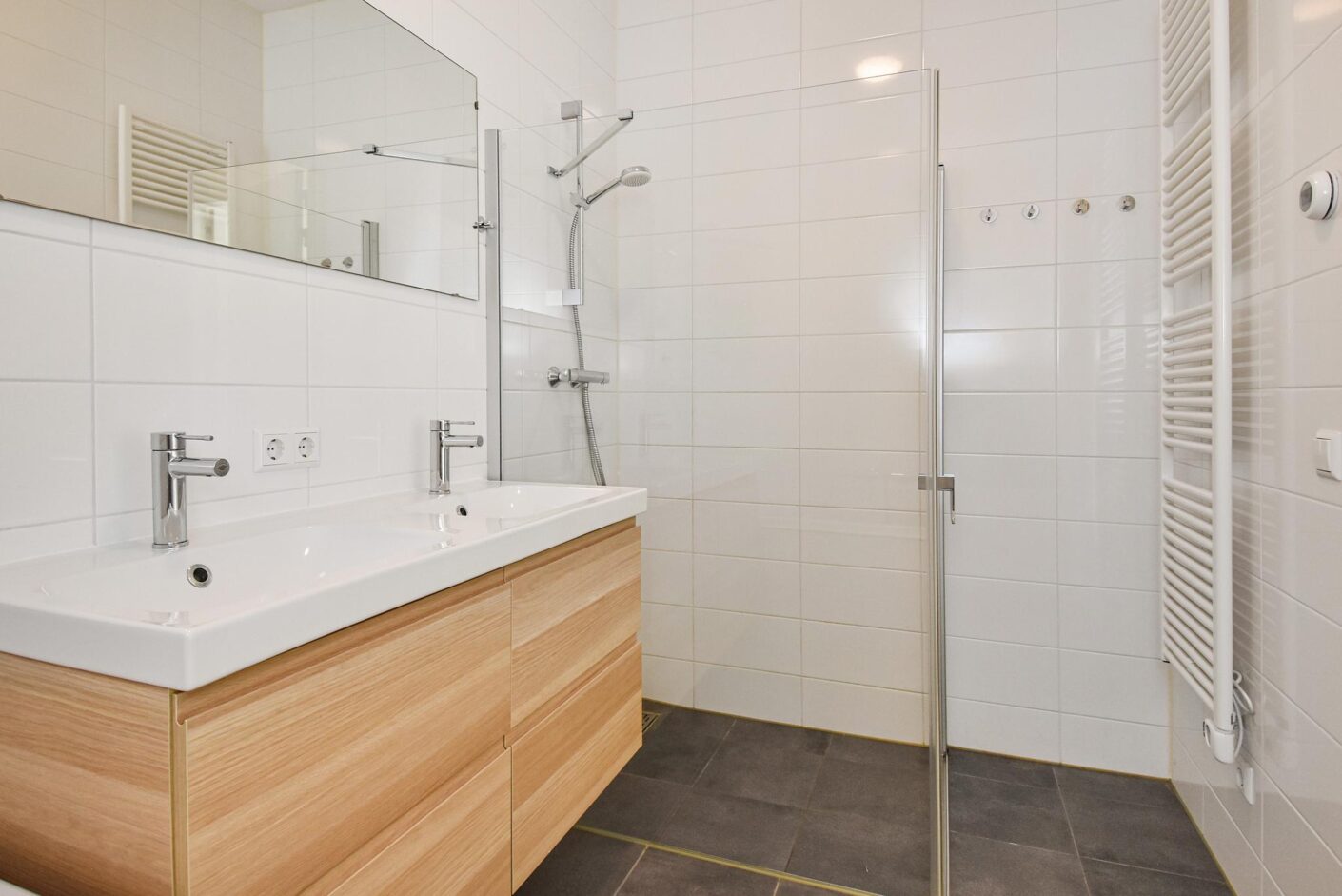 moderne badkamer met ligbad, inloopdouche, dubbele wastafel en designradiator