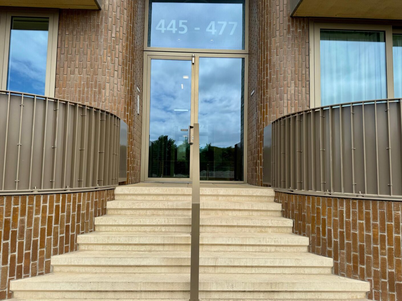 Secure central entrance, high-quality lobby with mailboxes and intercom panel; hallway leading to the entrance of the apartment on the first residential floor: