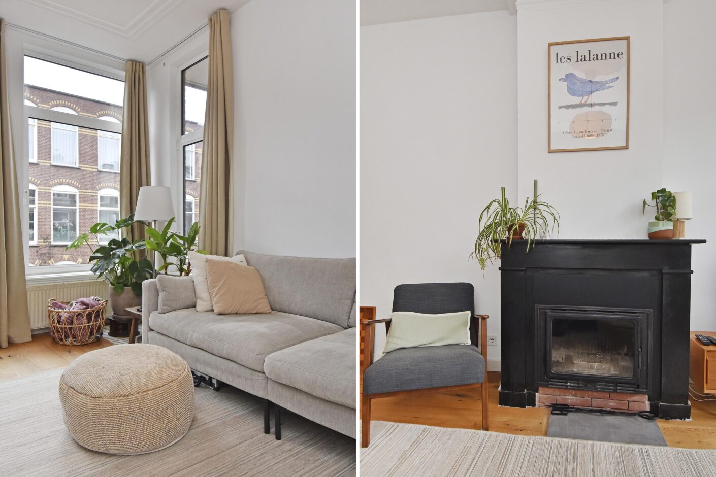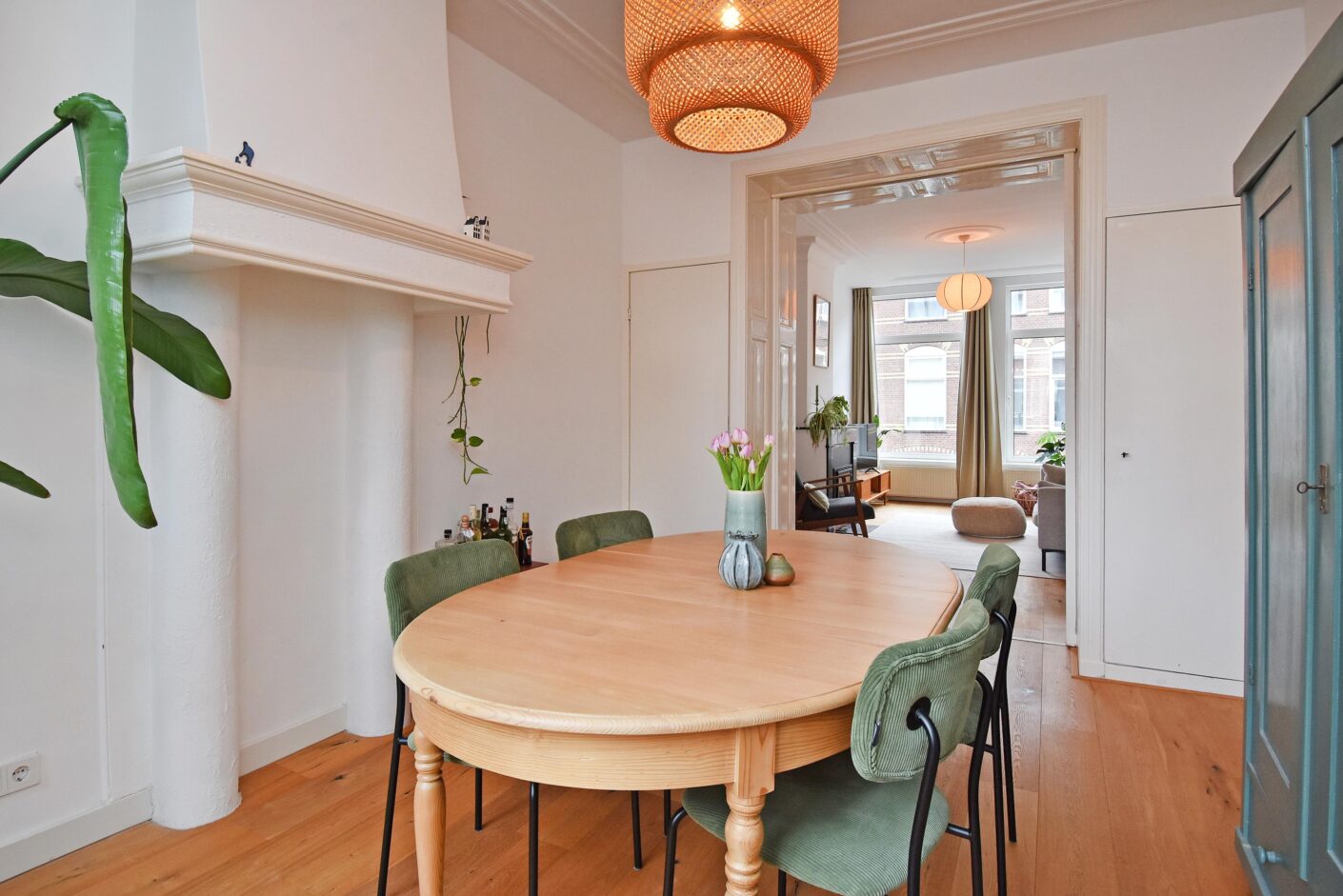 lichte woon-/eetkamer met schuifseparatie, vaste kasten, werkende openhaard en originele details
