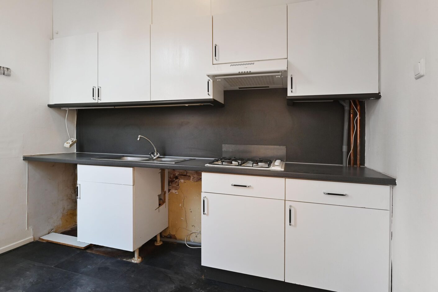 eenvoudige half open keuken met 4-pits gaskookplaat, afzuigkap en c.v. opstelplaats ca. 313 x 181