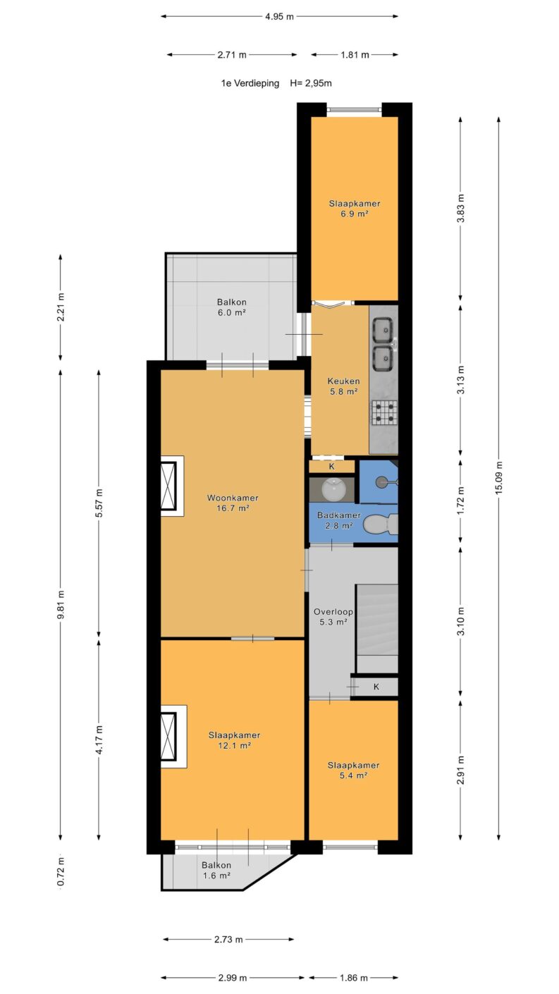 openslaande deuren naar achterbalkon (NW) ca. 221 x 271