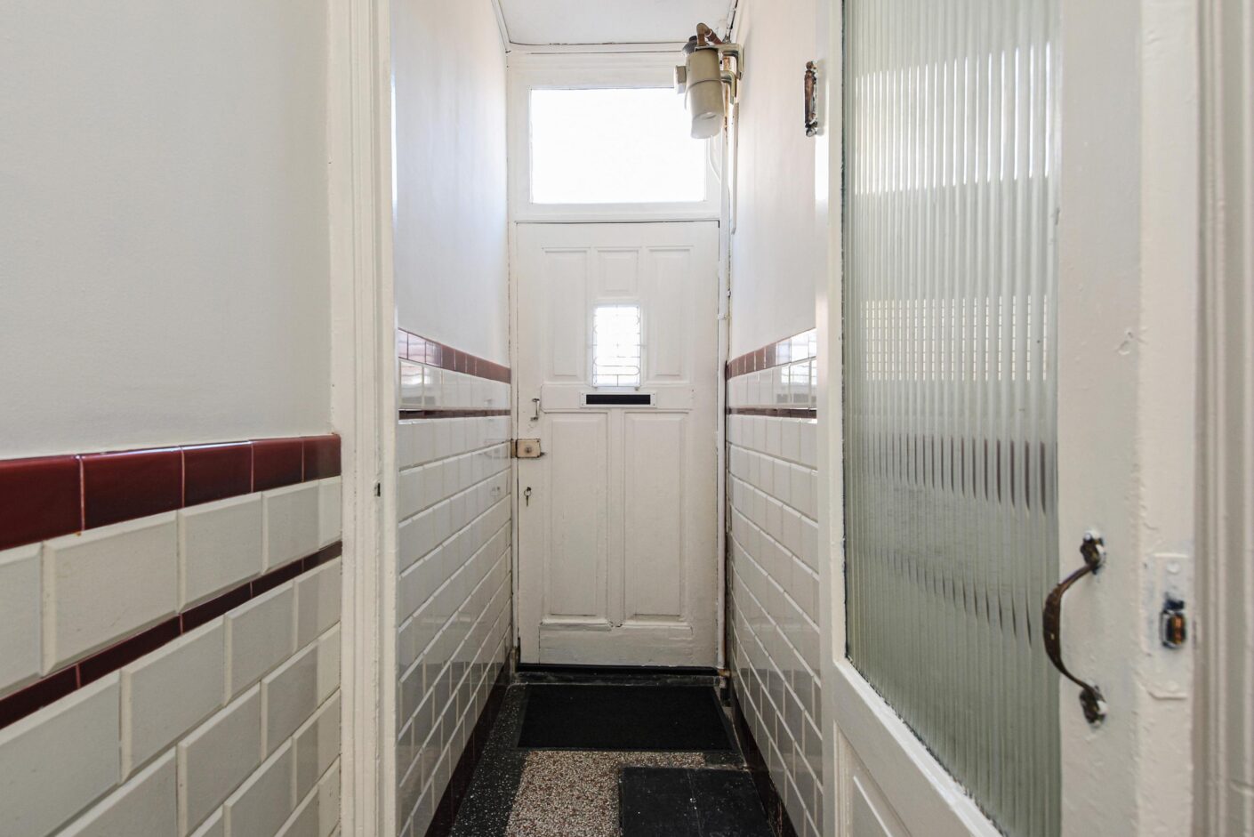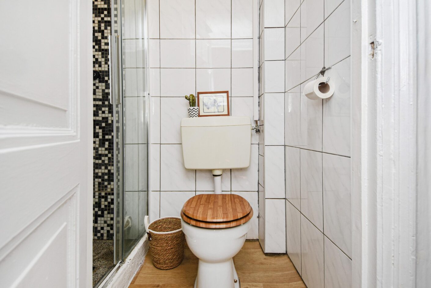 entree appartement: gang met kast en eenvoudige douche/toiletcombinatie
