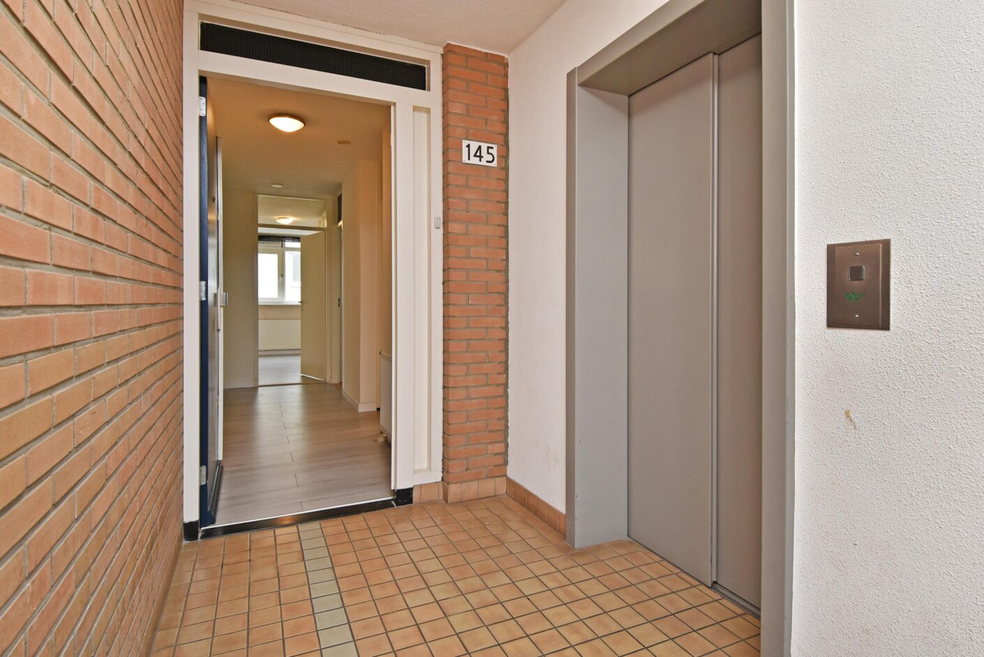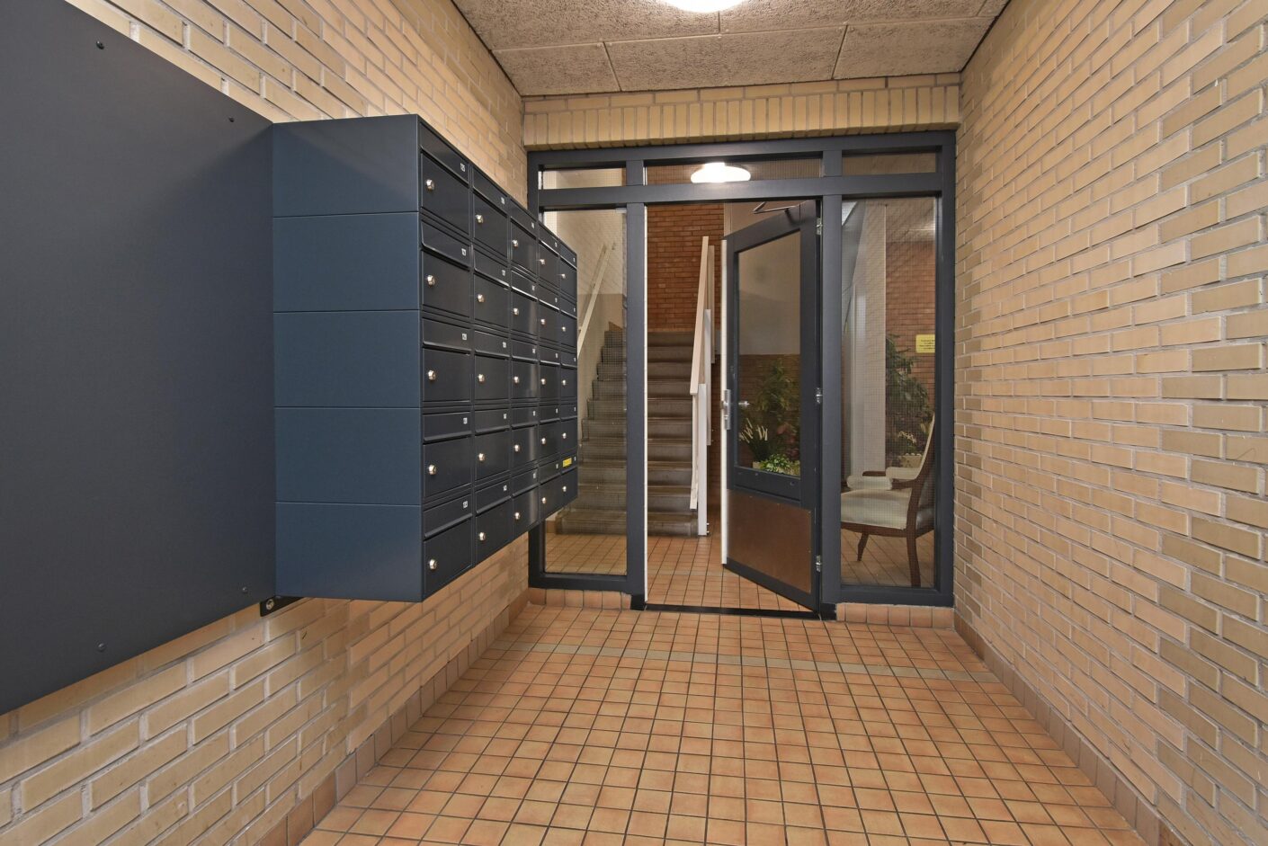 Afgesloten en beveiligde entree met bellen- en brieventableau: