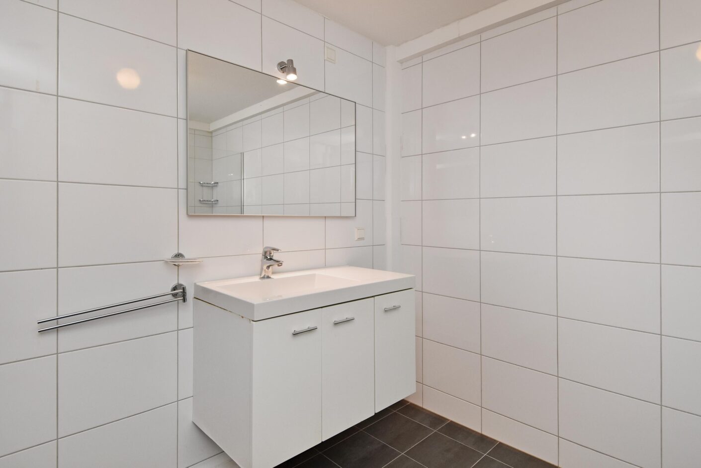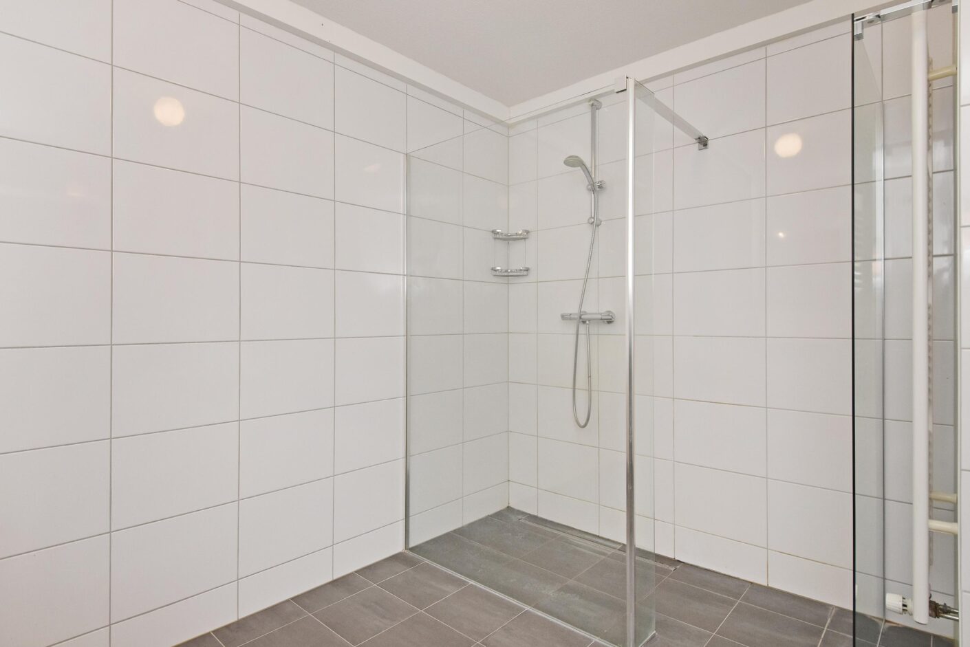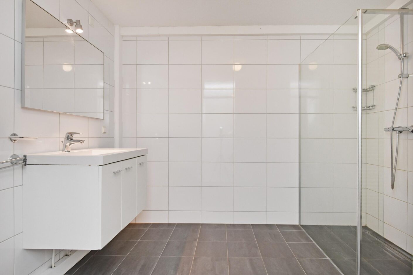 gemoderniseerde badkamer met inloopdouche, wastafel, designradiator en wasmachineaansluiting