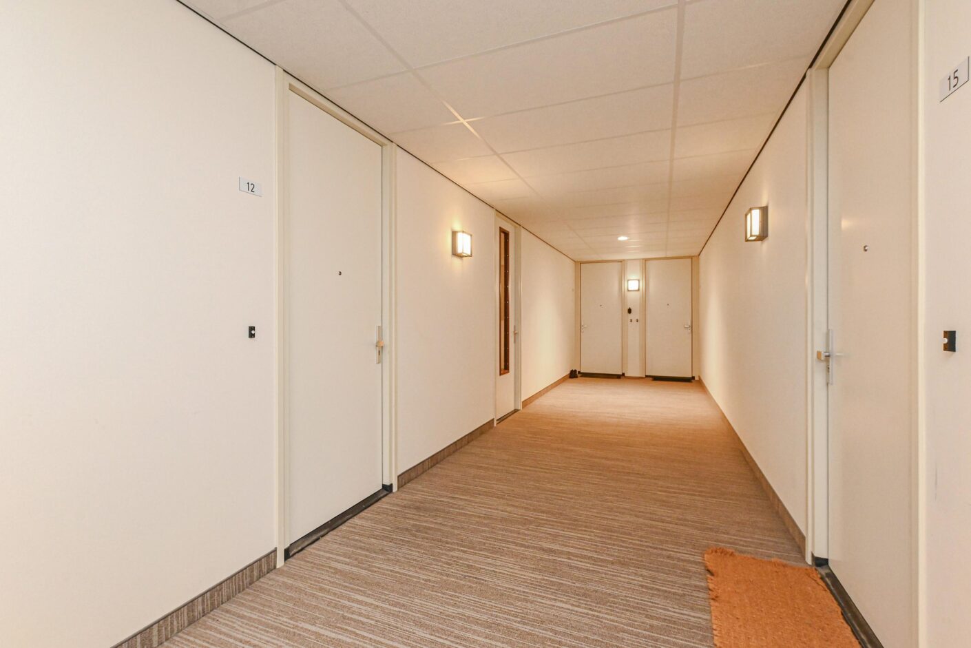 lange gang naar entree appartement: hal met meterkast, was-/stook-/bergkast en toilet